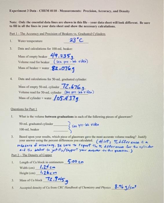 Determining the Density of Water During the semester in the general chemistry lab you will come into contact with various pieces of laboratory glassware. In this lab exercise students are introduced to various measurement tools ruler graduated cylinder triple beam balance and taught how to use them and correctly record data correct number of significant figures. Chemistry Name Date Class Accuracy and Precision Lab Accuracyhow close a measurement is to an accepted true value Precisiona tern used to describe how close repeated measurements are to each other Objective.